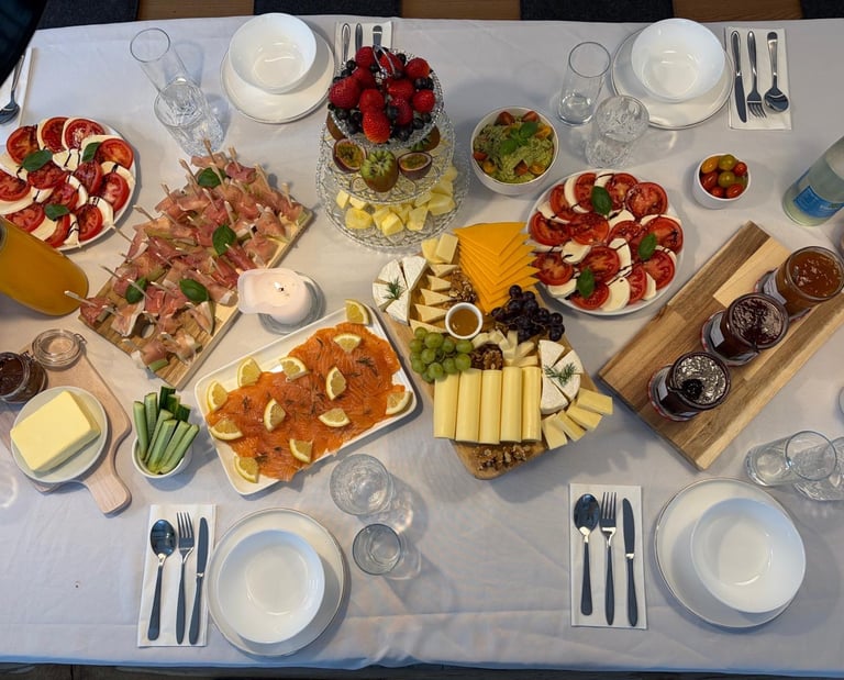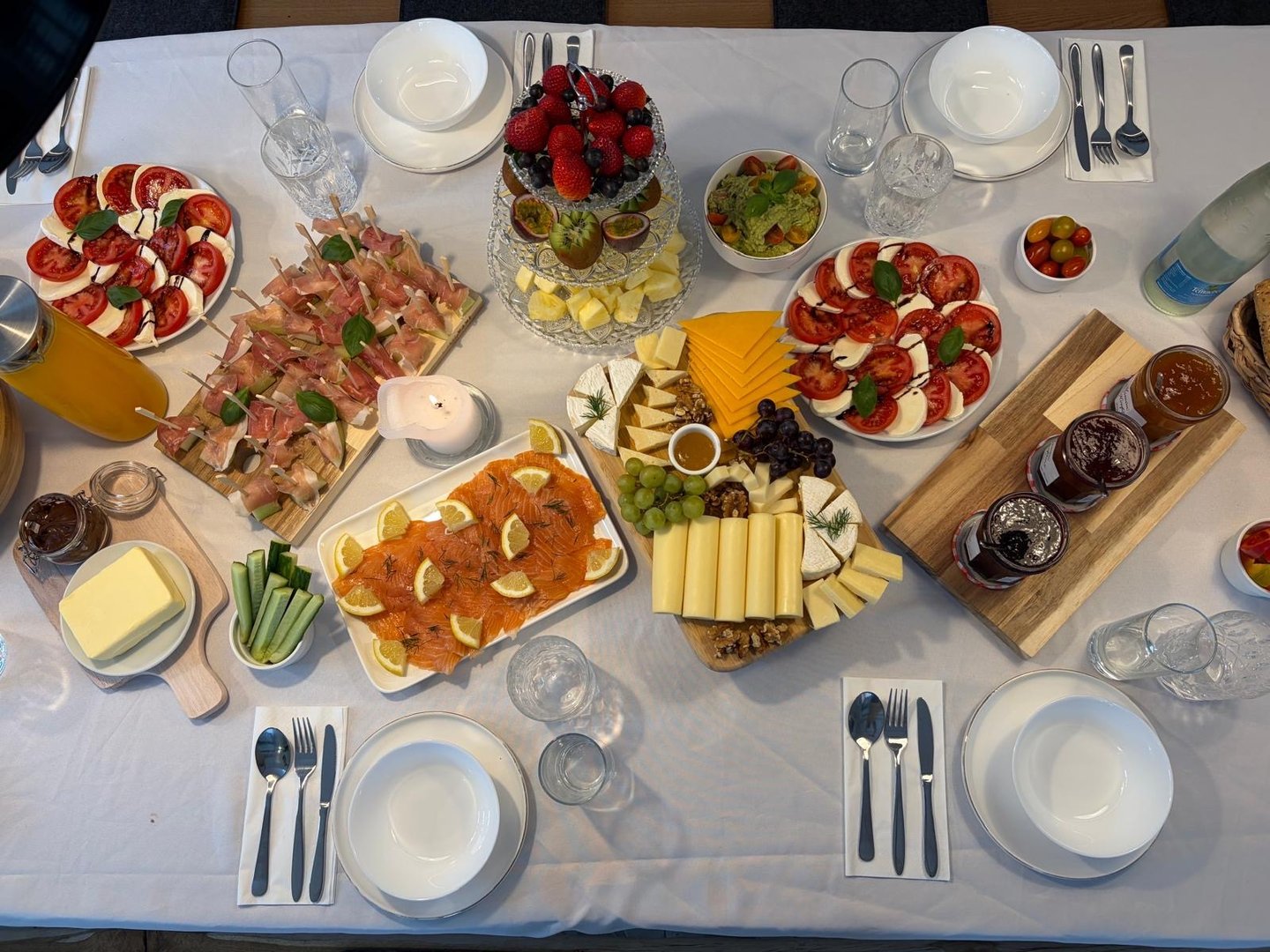 Unser Brunch findet ab 10 Personen an unserem großen Eichenholztisch statt und lädt ab 10 Uhr zum entspannten Genießen ein. Serviert werden ausgewählte Käse- und Wurstspezialitäten, Parma-Schinken mit Melone, frische Klassiker wie Caprese, Lachs, verschiedene Brotsorten, Aufstriche sowie Joghurt mit Müsli. Eierspeisen bereiten wir frisch nach Wunsch zu.