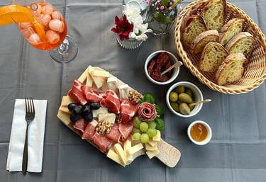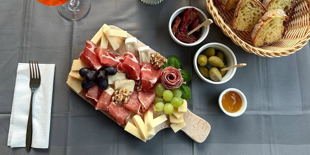 Auswahl italienischer Wurst- und Käsespezialitäten, serviert mit italienischem Brot, Oliven, getrocknete Tomaten in Öl und Feigensenf.